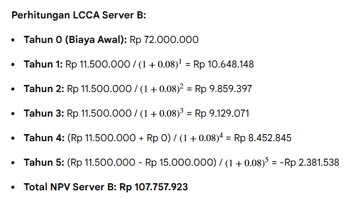 Rekomendasi: Perusahaan sebaiknya memilih Server B karena menawarkan total biaya kepemilikan yang lebih rendah dan keunggulan operasional lainnya.