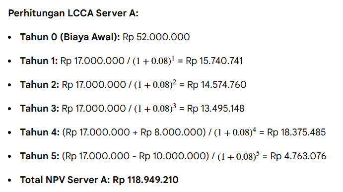 Manajer IT perusahaan harus memutuskan server mana yang lebih menguntungkan dalam jangka panjang. Analisis Biaya Siklus Hidup (LCCA) akan digunakan untuk memberikan gambaran yang lebih akurat dibandingkan hanya membandingkan harga awal.